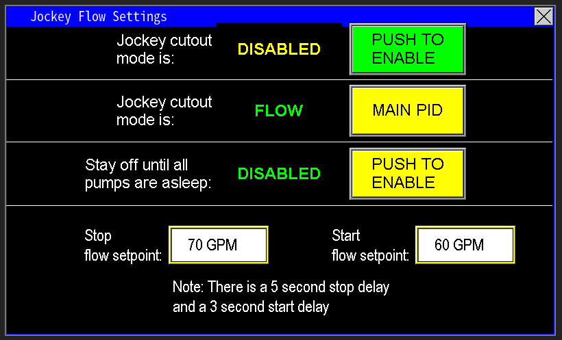 When the Jockey Cutout Mode is Enabled, you can configure the Jockey pump to start and stop based on either Flow or Main PID settings, as shown in Image 1.7. This allows for precise control tailored to the station’s operational needs.