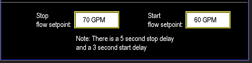 For example, if the flow meter reads 60 GPM or below, the Jockey pump will activate after a 3-second internal start delay. This is useful when the main pump is preparing to enter sleep mode or when the station is operating a smaller zone, allowing the Jockey pump to maintain lower pressure efficiently.