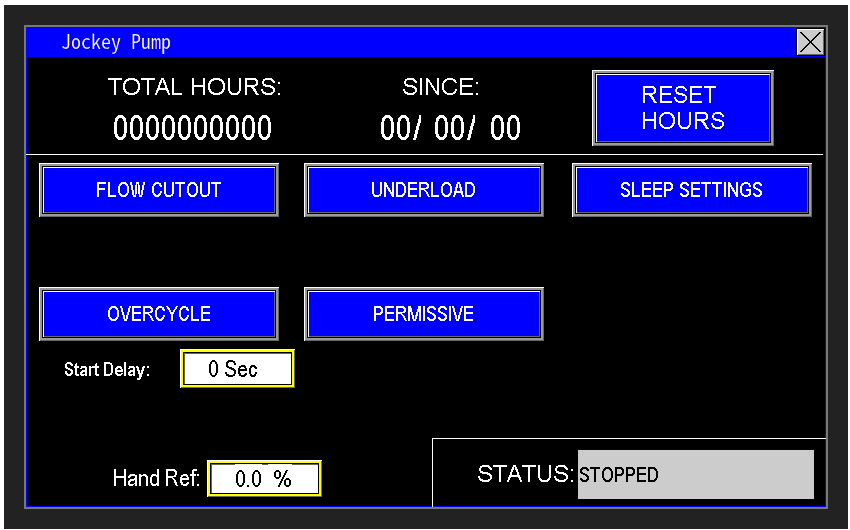 The jockey pump on Omnia systems is used as a pressure maintenance system and is usually used for getting the station to setpoint, and putting the station to sleep. Gain access to the Jockey pump settings by selecting Jockey on the main screen (image 1.0).