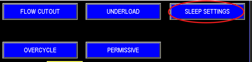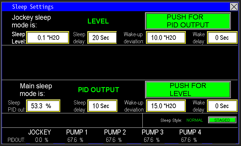 The Sleep Settings allow the pump station to automatically slow down and shut off when water demand ceases, as shown in Image 2.6. These settings, accessible via the shared sleep settings screen for the Jockey Pump, Main Pumps, and Intermediate Pumps (Image 2.7), optimize energy, efficiency and system longevity. Pumps can be put to sleep in two primary ways: Sleep by Flow or Sleep by PID Output. Additionally, if the station is configured as a pump-down system, a Sleep by Level setting will also be available, described below under “Sleep By Level” section.