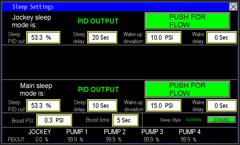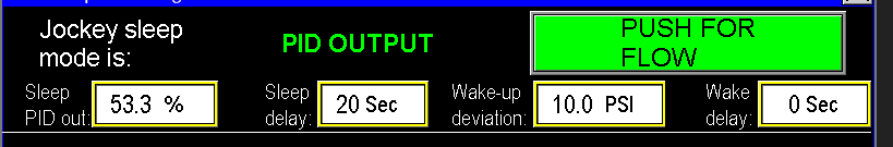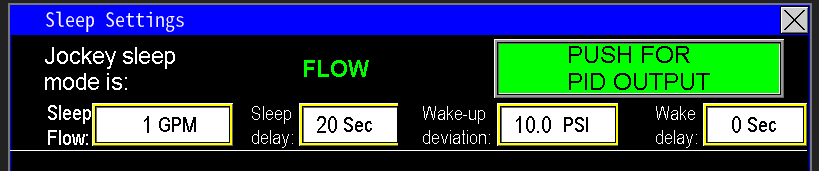 With the Sleep by Flow setting (Image 2.9), the PLC monitors the flow meter reading to manage the pump’s sleep mode, functioning similarly to the Sleep by PID feature described earlier. The key difference is that instead of triggering sleep mode based on a drop in PID output, the PLC initiates sleep mode when the flow rate falls below the designated setpoint. For example, if the flow drops below 1 GPM, the Jockey pump will enter sleep mode after the configured delay timer (as set in the sleep settings) completes.