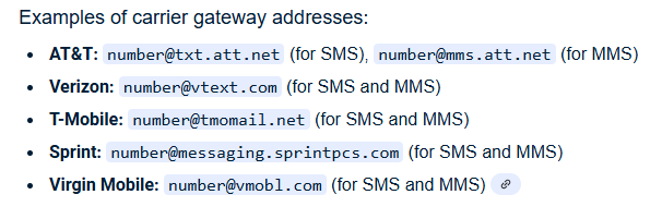 If configuring an a text to a number, here are a couple of services listed on how to properly set this up. If carrier is not listed below (image 1.5), search online for how to set it up.