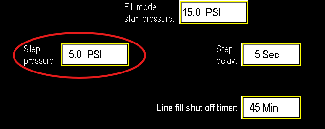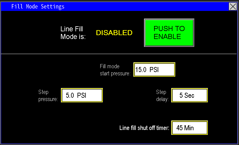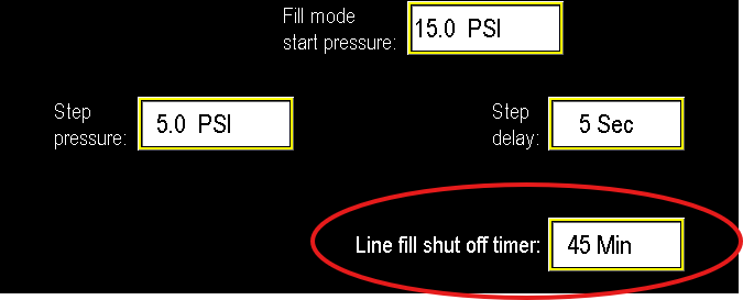 The line fill shut-off timer (image 1.4) indicates the expected duration needed for the station to fill the line when fill mode is activated. Because each pump station varies, the time required to pressurize the system can differ; the key is to monitor how pressure builds during this process.