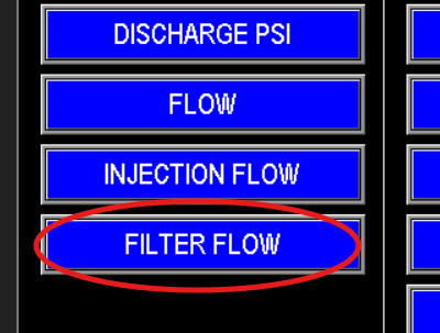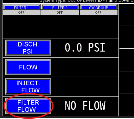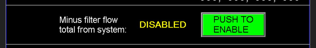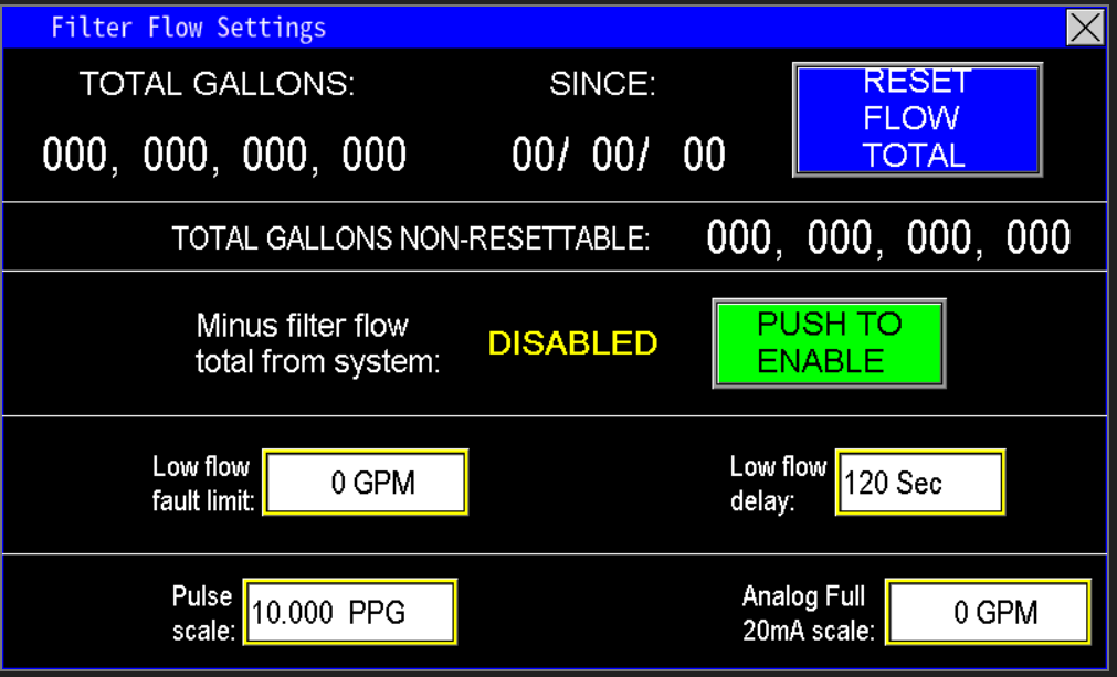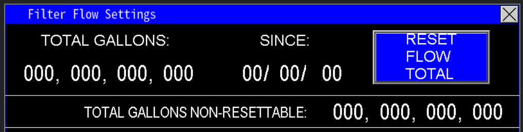 At the top of the screen (Image 1.4), the PLC displays real-time data collected from the filter flow meter, specifically the total gallons used for filter flushing. The "since" date indicates the last reset point; pressing the "Reset Flow Total" button will reset the gallons counter to zero and update the "since" date to the current date on the HMI.