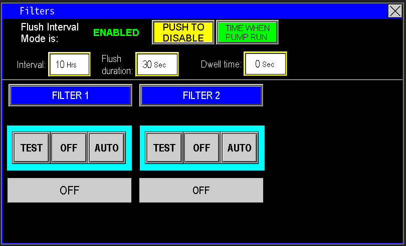 For filters equipped with a motor that operates during the flushing cycle, the control screen (Image 2.0) includes a "Push to Test" valve button. When pressed, this button allows independent testing of the valve itself without activating the motor, and the status of the test is displayed below.