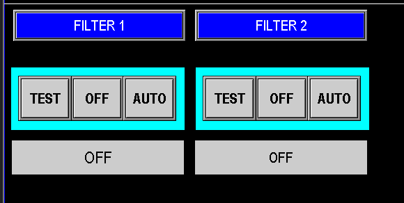 In configurations where the filter does not have a motor (Image 2.1), this test button is not visible. Instead, the virtual HOA (Image 2.2) uses its own control to turn the filter flush valve on, providing a manual override or test function separate from the motorized flushing sequence.