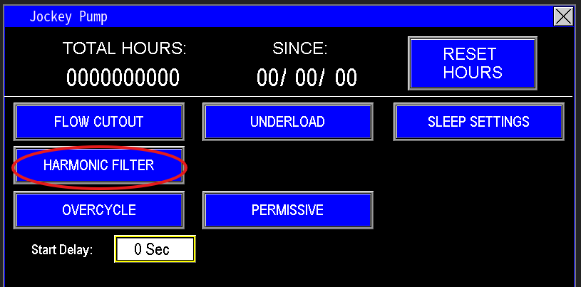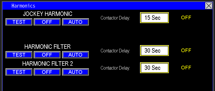 The Harmonic Filter control (Image 3.6) offers three virtual operator modes: OFF, TEST, and AUTO. In AUTO mode, when a motor starts and the harmonic filter is set to AUTO, a customizable timer delay activates. This delay allows the variable frequency drive (VFD) to ramp the pump to its normal operating speed, ensuring stable operation before the harmonic filter engages. The filter activates once the pump reaches a normal operating load, as harmonics can affect power quality at this stage, and remains active until the pump enters Sleep mode or is turned off.