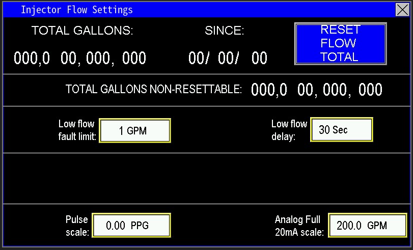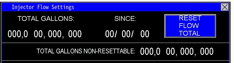 At the top of the screen (Image 1.2), the PLC displays real-time data collected from the injector flow meter.. The "since" date indicates the last reset point; pressing the "Reset Flow Total" button will reset the gallons counter to zero and update the "since" date to the current date on the HMI.