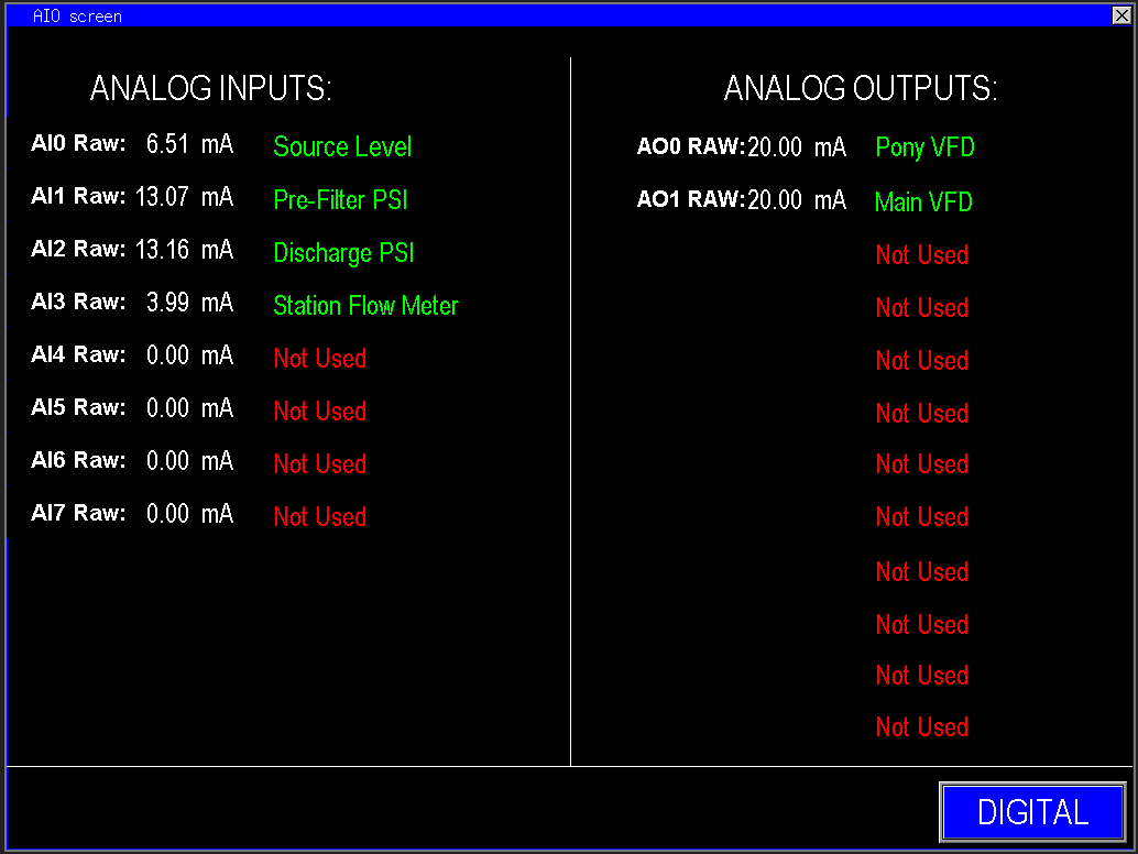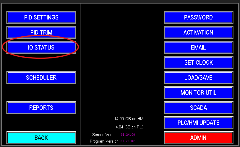 The IO Status screen displays real-time data on all inputs, outputs, and analog signals within the station. It provides an at-a-glance view of current sensor readings, valve statuses, relay states, and signal values. This makes it an invaluable tool for troubleshooting, verifying proper operation, and observing how the station responds to various conditions. If the station is acting unexpectedly or reacting oddly, the IO Status screen is the ideal place to monitor exactly what signals and signals states the system is detecting at that moment.