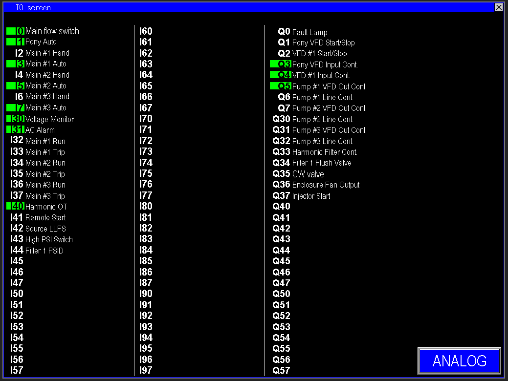 On the output side, Q3, Q4, and Q5 are turned on and supplying power to their respective devices, such as VFD contactors. To monitor the analog signals, click on the "Analog" button located in the bottom right of the screen. This allows you to view real-time analog input and output values for precise system monitoring.