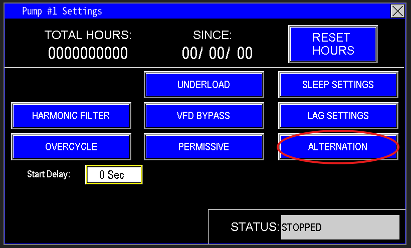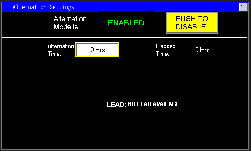 The Alternation function (Image 4.0) is automated based on a customizable timer. When Enabled, the station alternates the lead pump role according to the time interval set in the value box. In the example provided, the pumps alternate as the lead every 10 hours. The Elapsed Time display shows how long the current pump has been serving as the lead while in its running state, not idle.