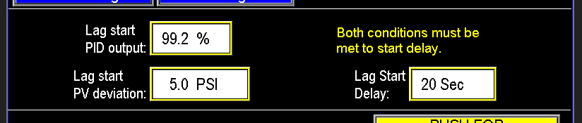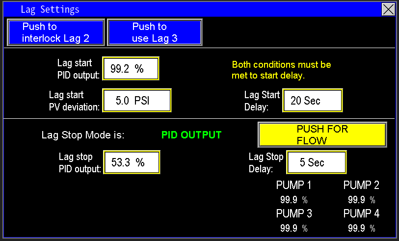 The Lag Start process for lag pumps depends on three key parameters: PID Output of the Lead Pump, Lag Start PV Deviation, and Lag Start Delay (Image 3.6). Both conditions—Lag Start PID Output and Lag Start PV Deviation—must be met to initiate the start delay.