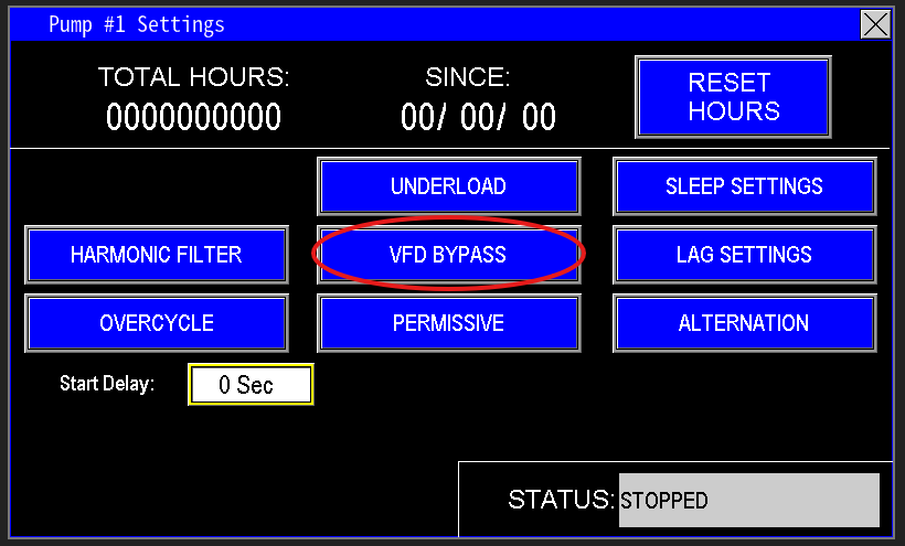 The VFD Bypass Mode (Image 3.0) disables the variable frequency drive (VFD), preventing it from slowing down the pump. When enabled, this mode impacts the automation of lag pumps, as the system relies on the lead pump’s hertz output to determine when lag pumps activate. Operating in bypass mode should not be done unattended, as it is intended strictly for emergency use. This mode is password-protected and should only be accessed by authorized personnel.