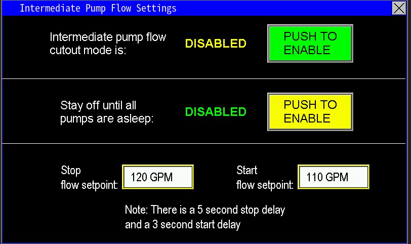 When disabled, the intermediate pump will follow normal pressure maintenance settings like the main pumps. When enabled, The pump will follow the Stop flow setpoints and start flow setpoints. In the screen example below, flow from the intermediate pump will start at any rate of flow less than 110 gpm, and stop once flow has reached 120 gpm or greater. The Stop time delay is set to 5 seconds internally, and the start delay is at 3 seconds internally.