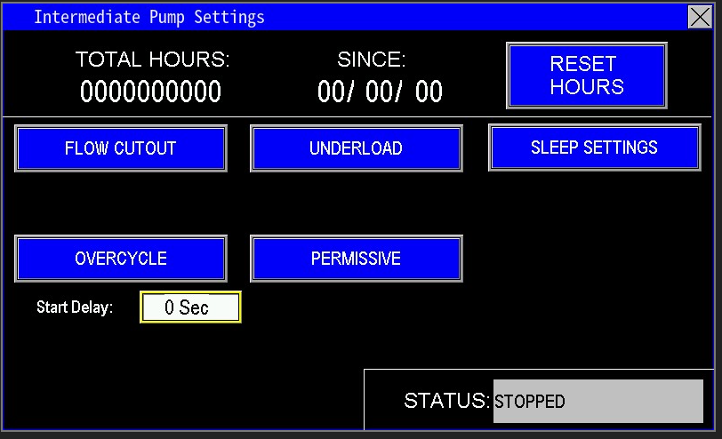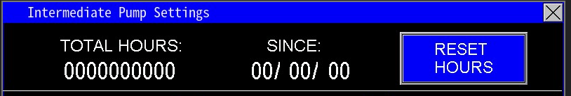 This section of the screen (Image 1.3) displays information specific to the intermediate pump. It shows the Total Hours the pump or motor has run and the Since date, indicating when the hours were last reset. The Reset Hours button resets the Total Hours to zero and updating the Since date to the current date. This feature is an effective way to track the operational lifespan of each pump or motor, particularly useful when a pump or motor is replaced due to a breakdown.