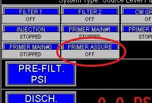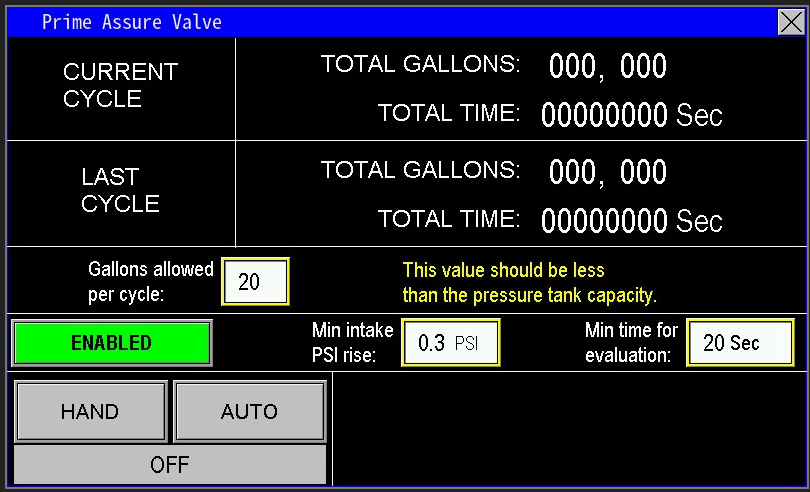 Prime Assure is a system that feeds discharge pressure back to the pump intake to keep the intake line primed while the station is asleep. By maintaining prime, it eliminates the reprime delay when the station wakes. If configured, the Prime Assure valve (see image 1.1) is accessible from the main screen.