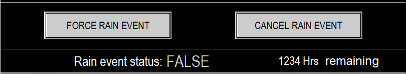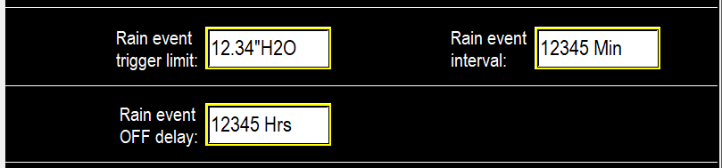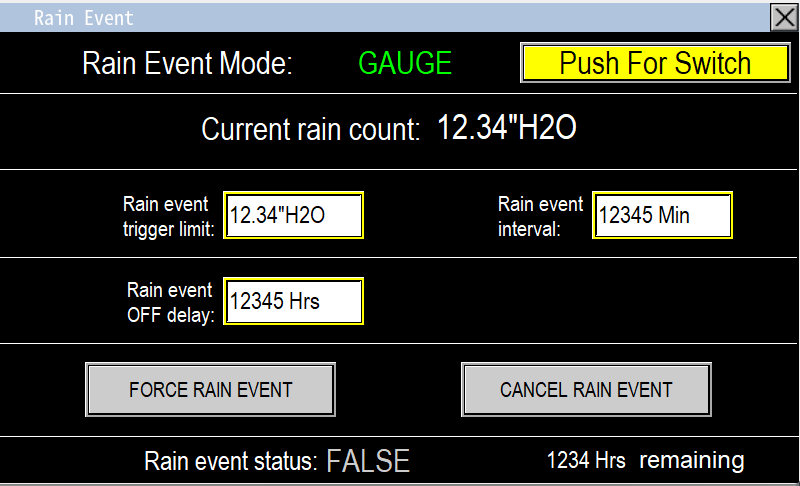 Rain Event Trigger: the accumulated rainfall threshold that activates rain lockout. When total rain reaches this value, the panel prevents normal pump operation.