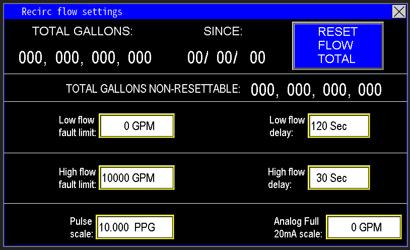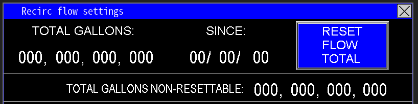 At the top of the screen (image 1.4), the PLC displays the total gallons recorded by the Recirc flow meter, representing the cumulative volume that has passed through the Recirc pump line. The “since” date indicates the last time the total was reset; pressing the “Reset Flow Total” button will reset the gallons count to zero and update the “since” date to the current date shown on the HMI.