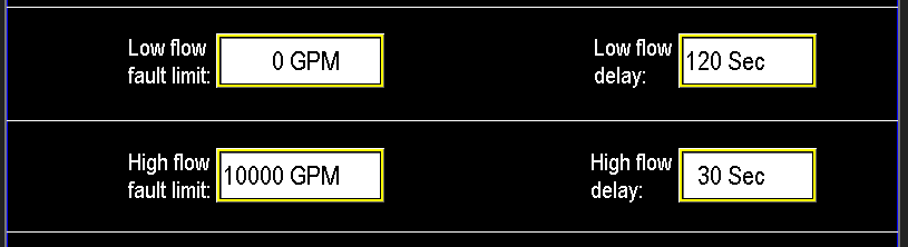 The low and high flow limits are safety and diagnostic thresholds designed to alert the PLC to potential issues with the Recirc pump system. Both settings monitor flow in GPM and include a timer delay to prevent false alarms (image 1.5).