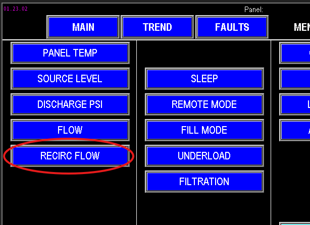 The Recirc flow meter monitors the total flow of water circulating through the Recirc Pump line. To configure or view the settings, access the Recirc flow parameters via the Main screen (Image 1.1) or the menu screen (Image 1.2).