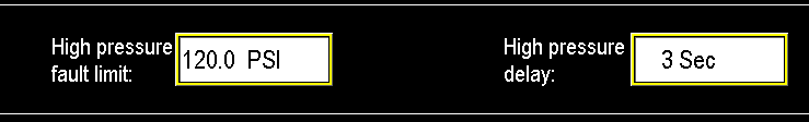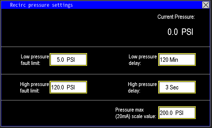 The Recirc high-pressure protection mirrors the low-pressure configuration but uses a much shorter fault delay—typically a few seconds—to protect system components (image 1.4). Set the high-pressure limit at or below the lowest maximum-rated PSI of system components to prevent damage. When the recirc pressure exceeds this limit, the recirc circuit will fault and shut down immediately. This fault applies only to the recirc pump; it does not fault the main station.