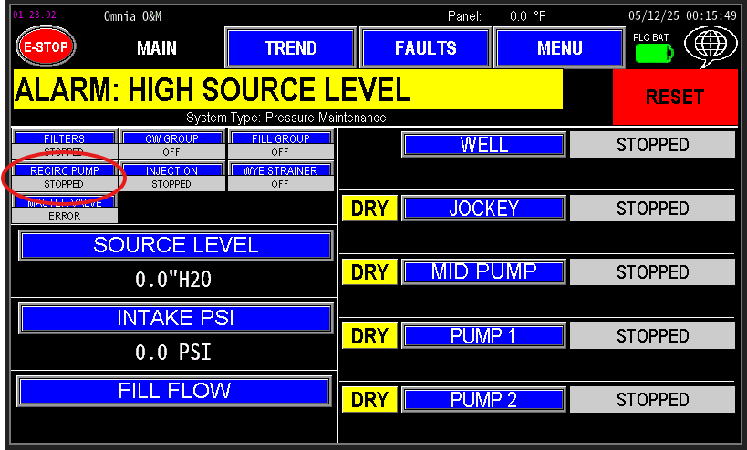 If the Recirc PSI Transmitter detects a low pressure condition, the PLC will initiate the Low Pressure Delay timer (Image 2.5). The recirculation pump will only fault for low pressure if the condition persists for the entire duration of this delay.
