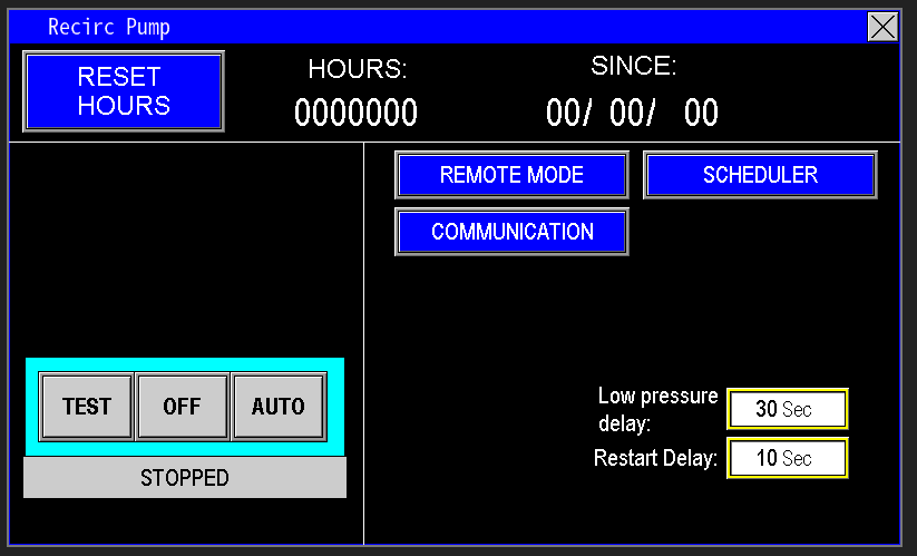 When the recirculation pump is placed in Test Mode, a Restart Delay timer is activated before the program signals the station to start the pump (Images 2.6 & 2.7). Since recirculation pumps are designed for low Total Dynamic Head (TDH), restarting them while water is rushing back can cause undue stress and potential damage to the motor, pump, and motor starting components. The restart delay allows the water to settle, ensuring a smoother and safer startup.