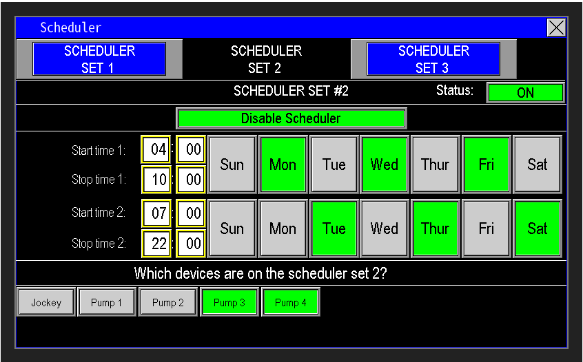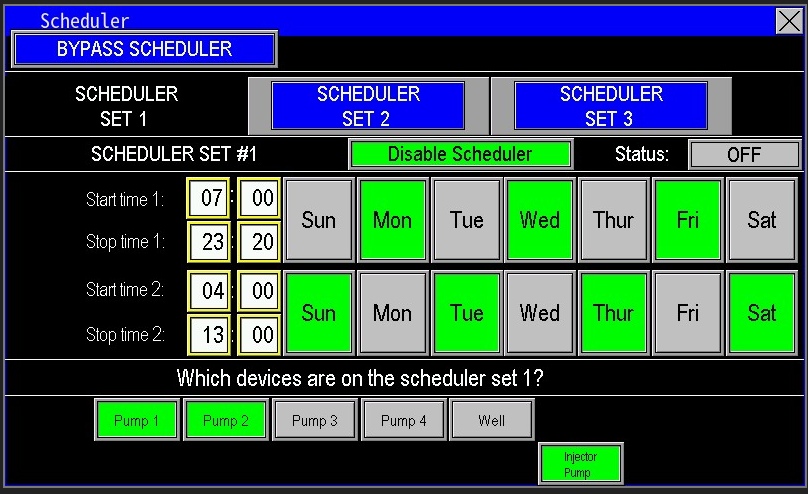 The scheduler provides flexible, customizable automation to control when the station runs and which pumps operate. There are three identical scheduler profiles to configure separate schedules as needed. The scheduler interface (image 1.2) is organized into several sections to simplify setup and ensure precise control of station runtime and pump selection.