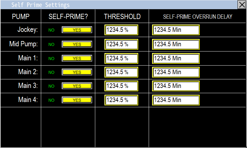 Self‑Prime settings can be applied to any pump that requires priming—settings are configurable per pump. Since station pumps may differ (some self‑priming, others not), configure this screen for each pump that needs priming to ensure correct sequencing and protection across the station.