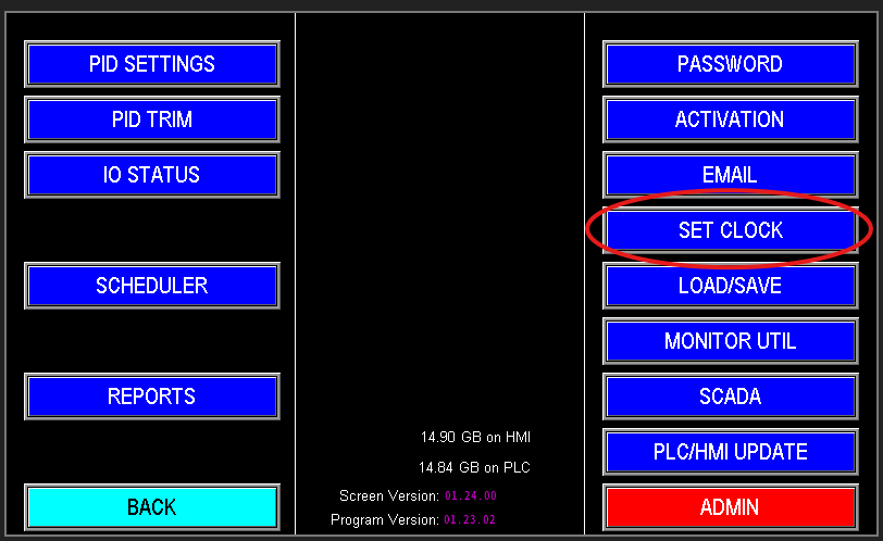 To edit the system time and date, select "Set Clock" to open the clock setup screen (image 1.1). All emails, records, and event timestamps use this HMI time — ensure the date and time are set correctly.