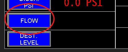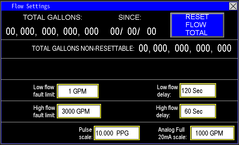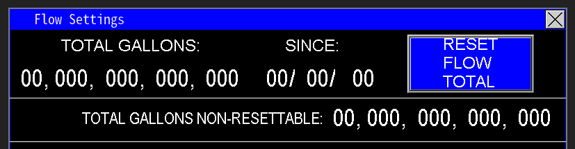At the top of the screen, the PLC displays the total gallons that have flowed through the station’s main flow meter (image 1.4). The “since” date indicates the last time the total flow was reset; pressing the “Reset Flow Total” button will reset this gallon count to zero and update the “since” date to the current date shown on the HMI.