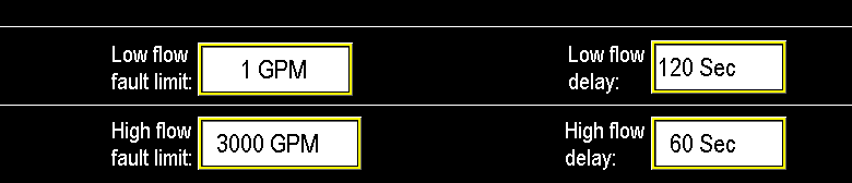 The low and high flow limits act as diagnostic thresholds to alert the PLC of potential issues with the station, preventing damage or inefficiency. Both limits monitor flow in GPM and include a timer delay to avoid false alarms (image 1.5).