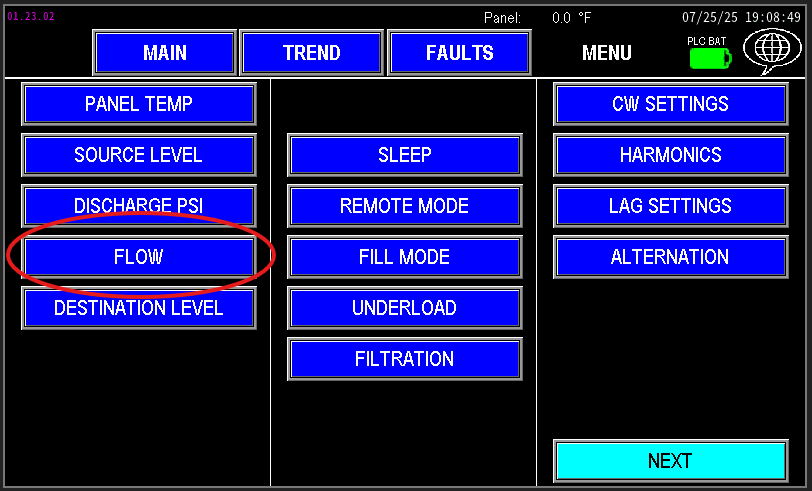 The station flow meter monitors the total volume of water passing through the main discharge line. To view or configure this flow meter, access the flow settings via the Main screen (Image 1.1) or the menu screen (Image 1.2).