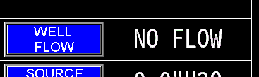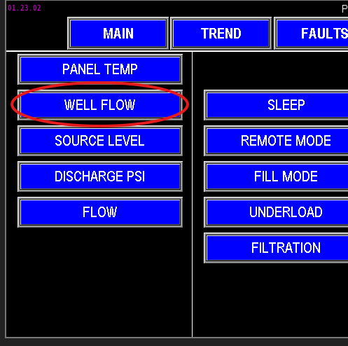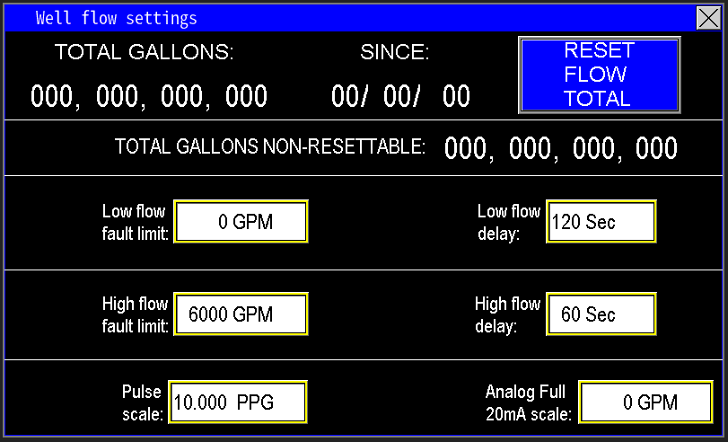 At the top of the screen (image 1.4), the PLC displays the total gallons measured by the well flow meter, representing the cumulative volume pumped by the well. The “since” date reflects the last time the total was reset; pressing the “Reset Flow Total” button will reset this value to zero and update the “since” date to the current date set on the HMI.